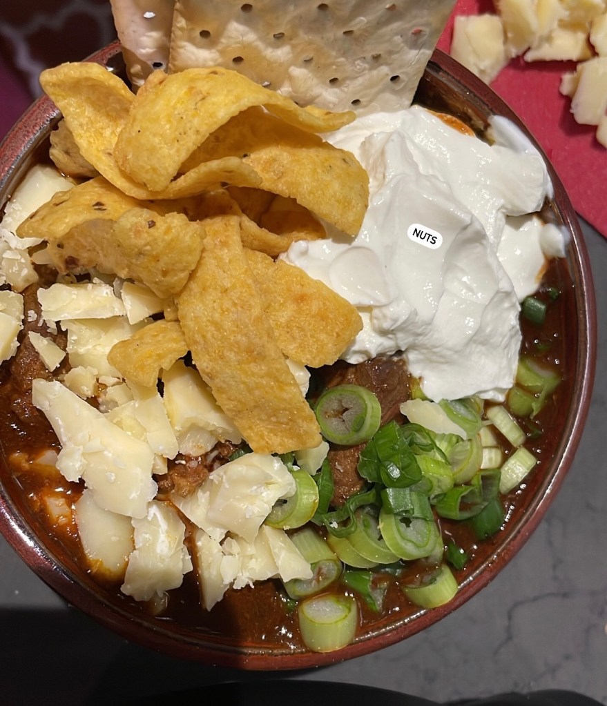 Garnish with shredded cheddar, scallions, sour cream and Fritos
